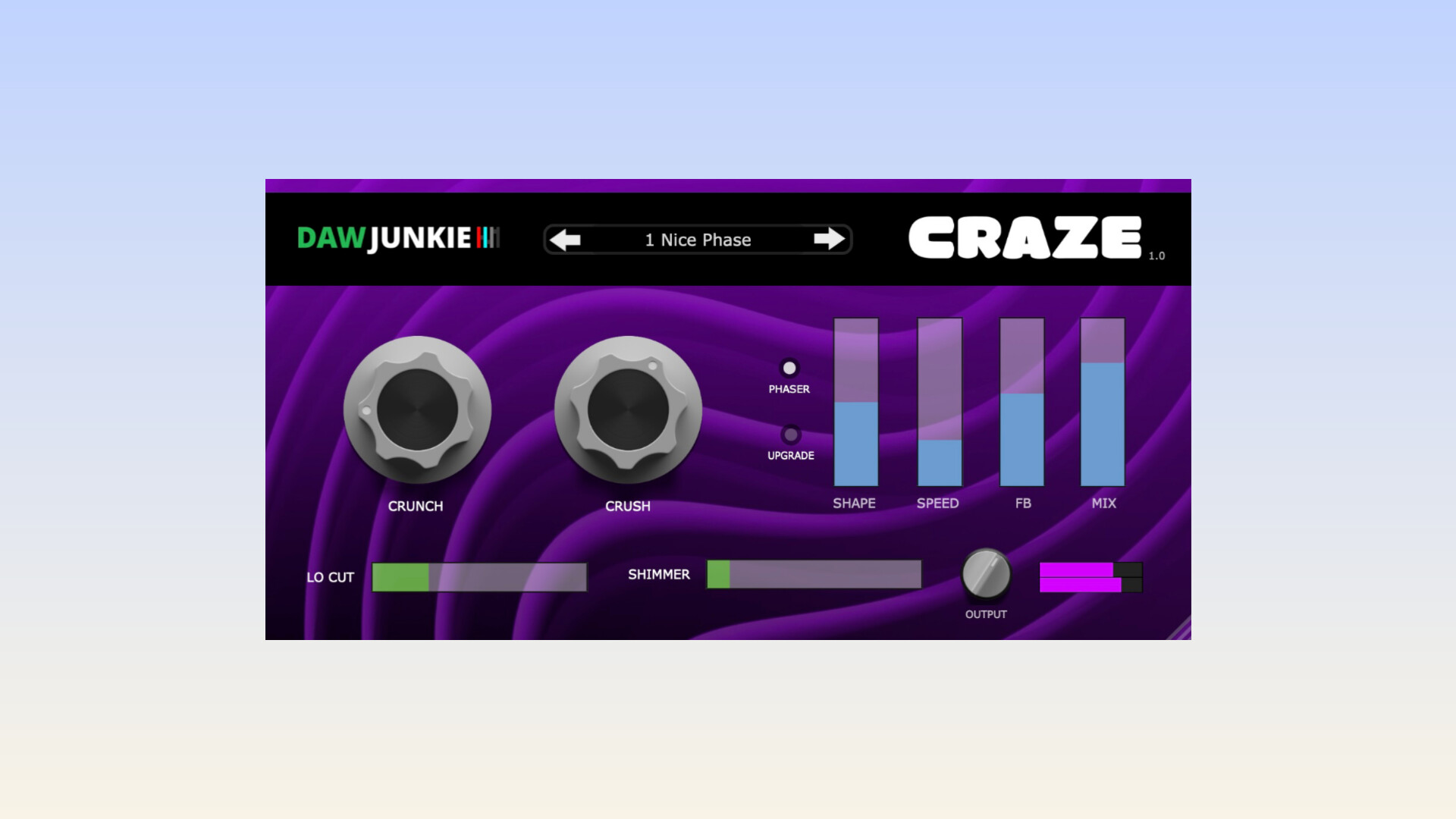 Craze is a free audio effect plugin developed by DAWJunkie. It is designed to function as a phaser with added character and saturation. While traditional phasers focus on smooth and musical sweeps, Craze leans into a rougher and more textured sound. The plugin is available for both Windows and macOS systems. It supports VST and AU formats, making it compatible with most major digital audio workstations including FL Studio, Ableton Live, Logic Pro, Reaper, Cubase, and others. Craze is distributed as a free download in exchange for an email signup. Once downloaded and installed, it can be used like any standard effect plugin inside your DAW.