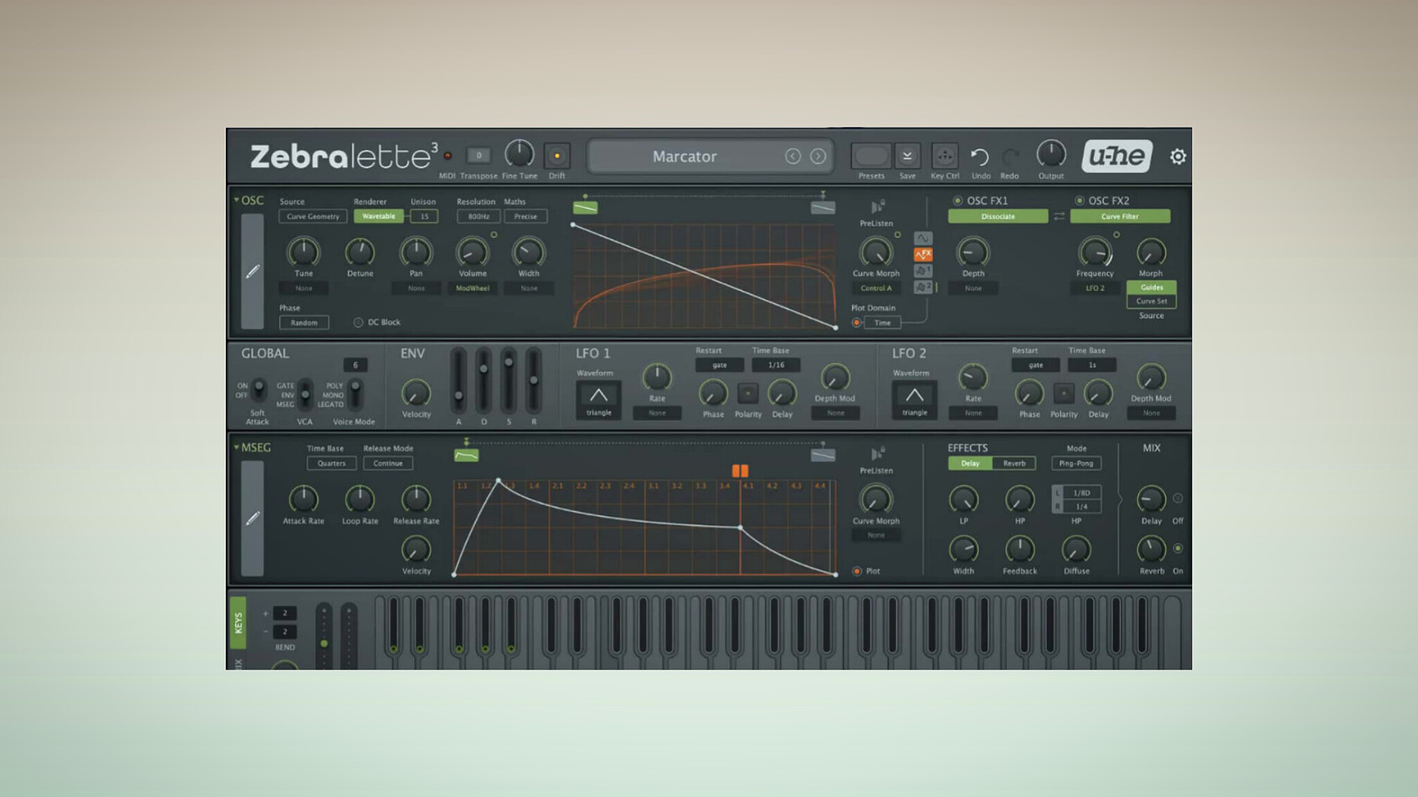 Modulation has been significantly improved in Zebralette 3. The synth now features a flexible modulation matrix that allows almost any parameter to be modulated. There are two tempo-syncable LFOs with multiple wave shapes and phase controls, making rhythmic and evolving modulation simple to set up. In addition, Zebralette 3 includes a powerful MSEG or multi-segment envelope generator, which allows users to draw custom envelope shapes and morph between multiple curves for complex movement and automation.